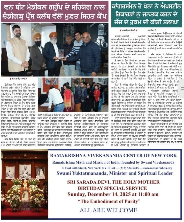Sardar Bahadur Singh, Founder and Chairman of One-Beat Medical Group Trust, was warmly felicitated by the Governing Council of the Chandigarh Press Club on Sunday, December 7, 2025